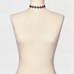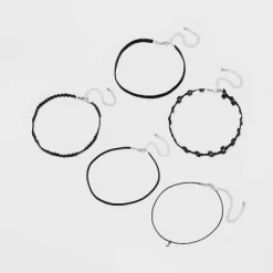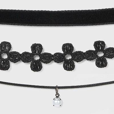 Five-piece choker necklace set from Wild Fableā¢. Includes necklaces in black, two slim and broad velvet bands, a rickrack lace-like piece, one with four-petal flower design and a slender cord with a milky faux-pearl drop pendant. Each necklace has a length of 12 inches and comes with a three-inch extender chain and a lobster-claw clasp.