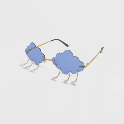 Novelty sunglasses from Wild Fable⢠in a blue color. Features a cloud-like shape with studded stones dangling down from gold-tone chains. Metal frame with a rimless design creates a sleek look, while the adjustable nose pads make them comfortable to wear. UV protection lenses help keep your eyes shielded. One size fit most faces.