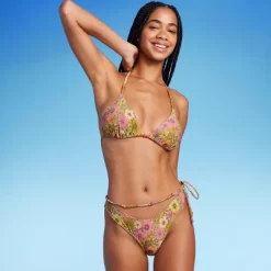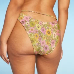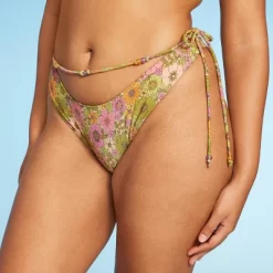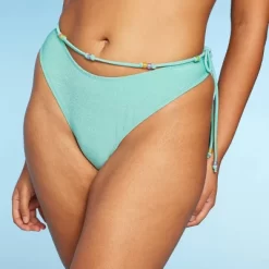 Pull-on bikini bottom from Wild Fable⢠with metallic fiber for a touch of shine. Made from soft fabric with spandex and full lining for flexible comfort in and out of the water. Designed with extra-cheeky coverage and a low-rise, extra-high-leg silhouette with elastic at leg openings. Beaded string tie detailing on the waist completes the look with elevated visual appeal.