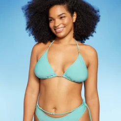 Triangle bikini top from Wild Fable⢠with colorful beads on front of straps. Made from soft fabric with spandex and full lining for stretchy comfort in and out of the water. Removable cups offer customizable coverage, while metallic fibers add a touch of shine. Back and behind-neck ties provide a snug, stay-put fit.