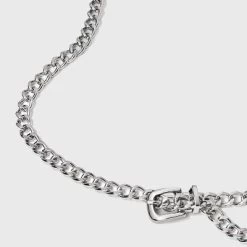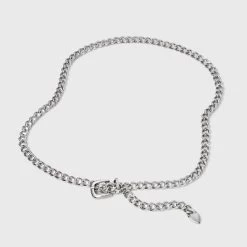 Silver-finish chain belt from Wild Fableā¢. 40 inches long and made of metal. Can be worn around the waist or hips, and it fastens with a buckle that’s adjustable utilizing the chain links for comfortable wear.