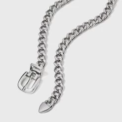 Silver-finish chain belt from Wild Fableā¢. 40 inches long and made of metal. Can be worn around the waist or hips, and it fastens with a buckle that’s adjustable utilizing the chain links for comfortable wear.