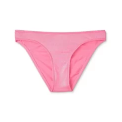 Low-rise, cheeky bikini bottom in iridescent pink. Made with soft, stretchy fabric featuring a full lining and a slight shine. Cheeky back and low-rise fit shows off more skin.