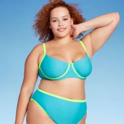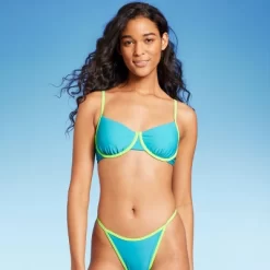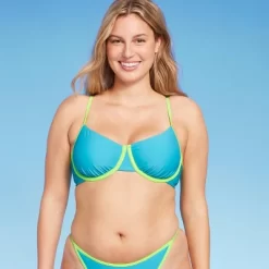 Underwire bikini top from Wild Fable⢠features contrasting straps and lining below the busts. Soft and stretchy fabric offers comfort, and back hook-and-loop fastener helps keep it secure. Removable cups lend a customizable look.