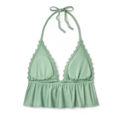 Soft green longline bikini top from Wild Fable⢠features crochet detailing and floral trim. Made from soft and stretchy fabric for comfortable wear and comes with a front tie to help keep the top secure. Removable cups offer customizable coverage.