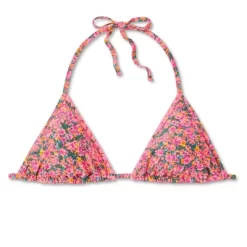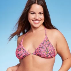 Pink triangle bikini top from Wild Fable⢠is designed with pink floral print. Soft and stretchy fabric construction with spandex offers flexible comfort. Halter neck design with back and behind-the-neck tie for easy closure. Removable cups offer customizable coverage.