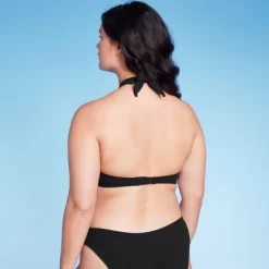 Halter bikini top from Wild Fable⢠in a solid color with pucker texture. Features a keyhole cross-front design. Made of a soft fabric with added spandex. Back hook-and-loop closure completes the look.
