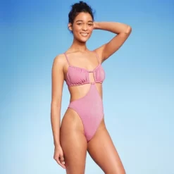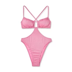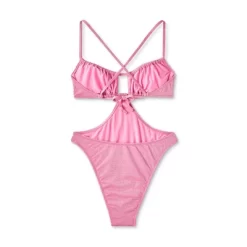 Pink lurex one-piece swimsuit from Wild Fable⢠features a keyhole front, cutout sides along with an extra-high-leg cheeky design. Stretchy fabric construction with removable cups. Crisscross back with adjustable tie provides the perfect fit.