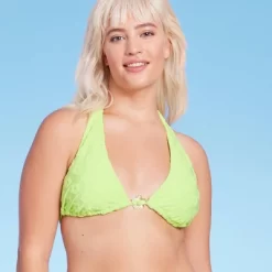 Triangle bikini top from Wild Fable⢠with daisy texture detailing. Designed with a floral ring at front. Made with soft and stretchy fabric for flexible movement. Back tie and behind-the-neck tie provide a secure fit. Removable cups offer customizable coverage.