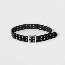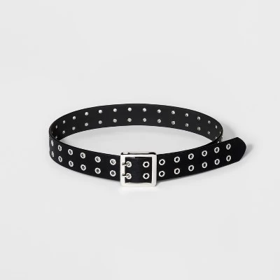 Black belt with silver grommets throughout. Made from faux-leather and has a shiny silver belt buckle. Double grommets let you adjust the fit. If youāre not satisfied with any Target Owned Brand item, return it within one year with a receipt for an exchange or a refund.