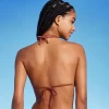 Ruched-front longline halter bikini top from Wild Fable⢠with shell-tipped drawstring fastening. Made from soft fabric with spandex and full lining for flexible comfort in and out of the water. Removable cups offer customizable coverage. Finished with behind-the-neck ties for a customizable, stay-put fit.