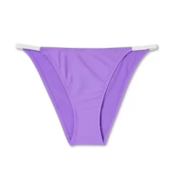Purple cheeky bikini bottom from Wild Fable⢠with contrasting white sides. Made with soft and stretchy fabric with full lining for flexible movement in and out of water. Pull-on style for easy slip-on and off.