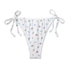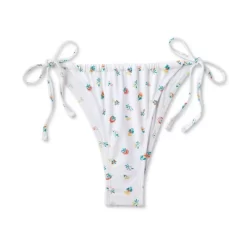 White bikini bottom from Wild Fable⢠adorned with a colorful floral print. Made from soft, stretchy fabric with elastic at the leg openings. Ultra-high-leg silhouette with a low-rise cut. Side string ties and adjustable cheeky coverage complete the look.