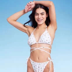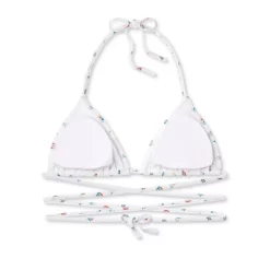 Strappy triangle bikini top from Wild Fable⢠in a floral print. Made from a soft and stretchy fabric with removable cups for customizable coverage. Features a high halter-neck design with adjustable neck strap and crisscross back straps. Showcases allover tiny floral prints on a white background.