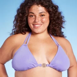 Lurex plisse bikini bottom from Wild Fable⢠in purple. Made from soft fabric with four-way stretch and full lining for flexible comfort in and out of the water. Tailored with extra-cheeky coverage and a low-rise, high-leg silhouette with elastic at leg openings. Side string ties with floral charms complete the look with a customizable fit and elevated visual appeal.