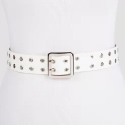 White faux-leather belt features a silver-finished buckle in a rectangular shape. Two rows of grommets adorn the belt for added dimension, complete with a silver-finished chain dangling off the side. If youāre not satisfied with any Target Owned Brand item, return it within one year with a receipt for an exchange or a refund.