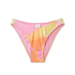 Tie-dye bikini bottom from Wild Fable⢠in pink, orange and yellow hues. High-leg, cheeky design in a low-rise silhouette. Soft and stretchy fabric and elastic at the leg openings offer flexible comfort.