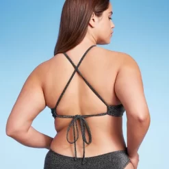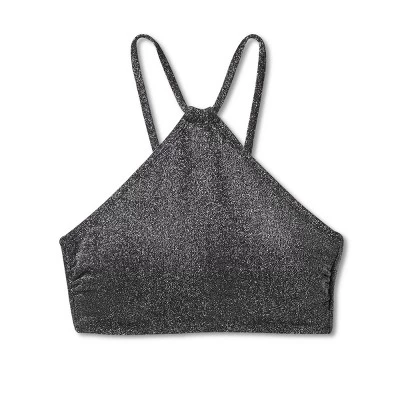 Black lurex bralette bikini top from Wild Fable⢠with a halter-style high neckline. Made of soft fabric with a blend of metallic fiber and spandex. Slender shoulder straps make a crisscross design at the back and fasten for an adjustable fit.
