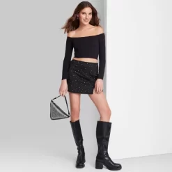 High-rise bodycon mini skort from Wild Fable⢠in black with a dot pattern. Hits at the thigh and closes with a side zipper. Comes with built-in shorts and back elastic for comfort. Made from recycled polyester fabric with a touch of spandex for stretch.