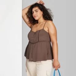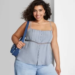 Spaghetti strap cami with lace trim from Wild Fableā¢. Features adjustable shoulder straps with tie detail in back. Front designed with pleats, buttons and lace trim on neckline and below bust. Lightweight fabric with a relaxed fit and flattering drape. Hem hits below waist.
