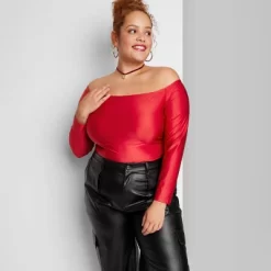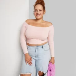 Long-sleeve off-the-shoulder T-shirt from Wild Fableā¢. Crafted from midweight jersey fabric with spandex and soft lining for stretchy comfort. Tailored in a slim-fit silhouette with a cropped length that hits just above the waist. Designed in a solid hue with peached finish.