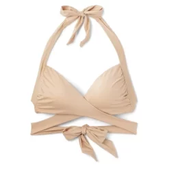 Gold bralette bikini top from Wild Fable⢠tailored in a longline silhouette with a wrap front. Made of stretchy fabric with full lining and comes with removable cups. Back tie and halter straps complete the look with a custom fit.