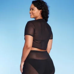 Stylish sheer mesh cover-up top from Wild Fable⢠with cap sleeves. Features a just-above-the-waist length and ruched front with tie detail. Made with recycled polyester fabric with spandex for comfort and breathability.