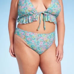 Pull-on bikini bottom from Wild Fable⢠with a seamless floral print in pink, yellow and blue shades on an aqua green background. Made from soft fabric with spandex and full lining for stretchy comfort in and out of the water. Pull-on style allows for easy on and off. Cheeky coverage and a mid-rise, high-leg cut finish off the chic look.