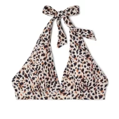 Tall triangle bikini top from Wild Fable⢠with an animal spot print in black and brown on a white background. Made of a soft, stretchy fabric with removable cups. Halter behind-the-neck ties and a lace-up back with string tie fastening complete the look with a customizable fit.