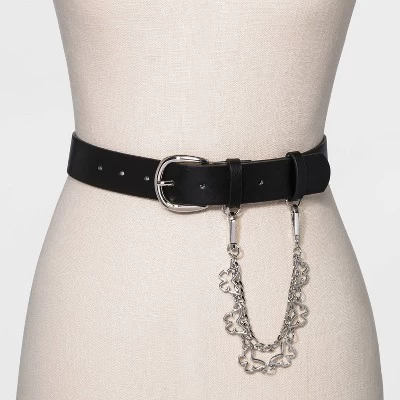 34-inch-long, faux-leather belt in solid black. Features an elongated silver-tone buckle fastening with multiple hole adjustments to offer you a customized fit. Comes with a silver-finish smaller chain embellished with butterfly charms that can be attached to the two belt loops of the black belt as an extra decoration or removed to suit your liking.