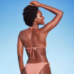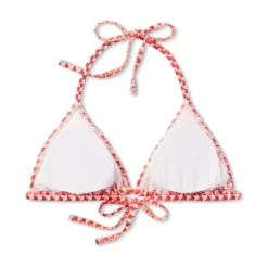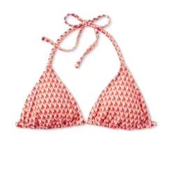 Triangle bikini top from Wild Fable⢠with ribbed texture and a seamless multicolor geometric print. Made of soft, stretchy fabric with removable cups. Halter straps with behind-the-neck ties and a slender string with back fastening complete the look.