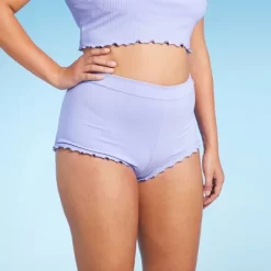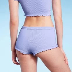 Boyshorts bikini bottom from Wild Fable⢠with ribbed texture and ruffle accents. Made of recycled polyester fabric with added spandex for comfortable wear. Tailored in a mid-rise silhouette. Pull-on style completes the look with easy slip-on and take-off.