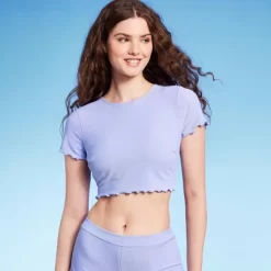Ribbed short-sleeve rashguard from Wild Fable⢠with ruffle detail on the sleeves and hem. Tailored in a cropped length, itās made from soft fabric with spandex for comfortable wear. Built-in shelf bra with removable cups completes the versatile design.