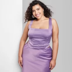 Satin corset tank top from Wild Fable⢠in a solid hue with adjustable shoulder straps. Features a square neckline with corset-inspired stitching accents and a curved hem on the front. Tailored in a slim-fit silhouette and made from midweight recycled polyester with lining for comfortable wear. Pullover style and a smocked back panel complete the look.