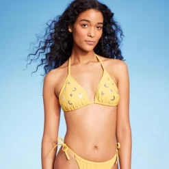 Halter-neck triangle bikini top from Wild Fable⢠in a yellow color for a bright look. Features sequin detailing in moon, sun and other shapes. Made from soft and stretchy fabric and comes with behind-the-neck hook and back tie that helps provide a secure fit. Removable cups offer customized coverage.