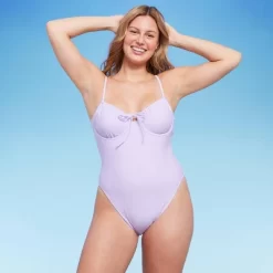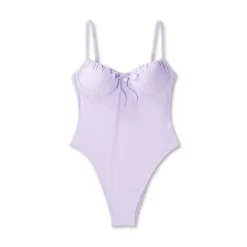 Shirred detail swimsuit from Wild Fable⢠with a tie accent. Lilac purple color with an extra-cheeky and extra-high-leg silhouette. Soft and stretchy fabric with soft fabric lining offers flexibility and comfort. Adjustable straps help provide the perfect fit, while the underwire design provides the right support. Pull-on style for easy on and off.
