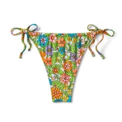 Ultra-cheeky bikini bottom from Wild Fable⢠adorned with a vibrant floral print in light green, blue, light pink, coral, orange, yellow and light purple shades on a white background. Made of a soft fabric with added spandex. Tailored in an ultra-high-leg, low-rise silhouette with elastic at leg openings. Tunneled side string ties complete the look and provide adjustable coverage and fit.