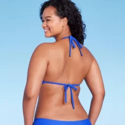 Solid-color triangle bikini top from Wild Fableā¢. Made with soft and stretchy fabric with a strappy design. Halter neck and back tie provide a secure fit.