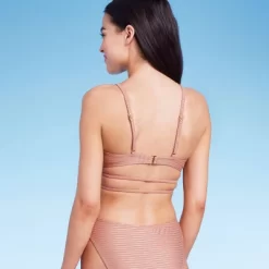 Brown lurex bikini top from Wild Fable⢠features gold-tone stripes and a strappy design. Made from soft and stretchy fabric with full lining. Crisscross straps, front tie and back hook-and-loop fastener help keep the top secure, while D/DD features adjustable back straps. Removable cups offer customizable coverage.