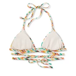 Multicolor triangle bikini top from Wild Fable⢠features wave-like stripes. Made from soft and stretchy fabric for comfortable wear. Features a crisscross strappy design around the waist and back and behind-the-neck ties. Removable cups offer customizable coverage.