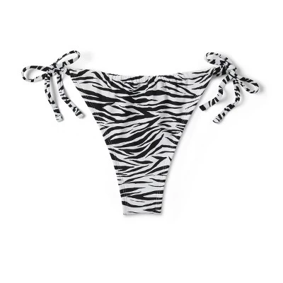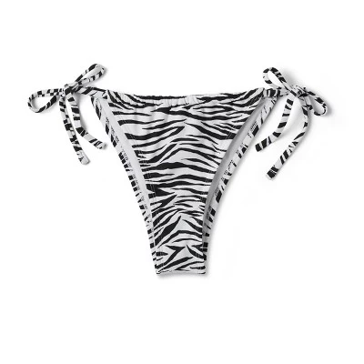 Zebra-print bikini bottom from Wild Fable⢠in black and white. Made of a soft fabric with added spandex and elastic at leg openings for comfortable wear in and out of the water. Tailored in a low-rise, ultra-high-leg, ultra-cheeky silhouette. Side string ties complete the look with a customizable fit and coverage.