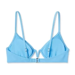 V-front bikini top from Wild Fable⢠in light blue. Made from soft fabric with spandex for stretchy comfort in and out of the water. Adjustable straps and removable cups with underwire offer customizable coverage and fit. Back hook-and-loop closure keeps top secured.