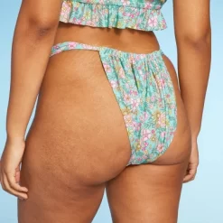 Pull-on bikini bottom from Wild Fable⢠with a seamless floral print in pink, yellow and blue shades on an aqua green background. Made from soft fabric with spandex and full lining for stretchy comfort in and out of the water. Pull-on style allows for easy on and off. Adjustable coverage and a low-rise, high-leg cut with wide straps finish off the chic look.